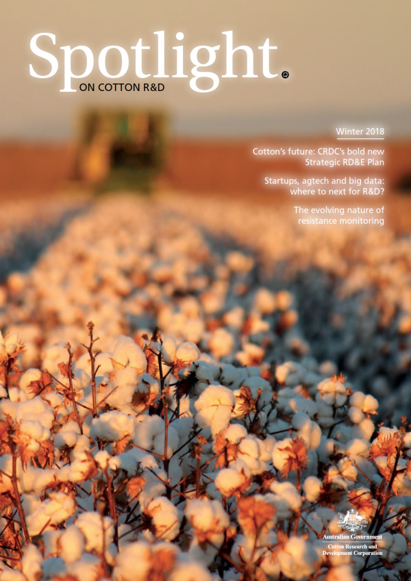 In addition, this edition tackles global news of a cotton 'megapest', talking to Australian experts about what this means for the industry and Australian growers; CRDC's work with the startup community through accelerators, incubators and venture capitalists to bring beneficial new technology products and services to the industry (including an exciting new CRDC-supported initiative at this year's Australian Cotton Conference, Startup Alley); and the outcomes of the CottonInfo researchers tour from February 2018, which focused on optimising irrigation and nitrogen use efficiency and took a team of researchers out to six cotton growing valleys to meet with 440 growers and consultants.